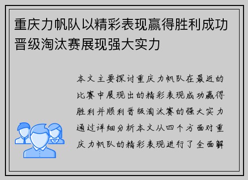 本文主要探讨重庆力帆队在最近的比赛中展现出的精彩表现,成功赢得胜利并顺利晋级淘汰赛的强大实力。通过详细分析,本文从四个方面对重庆力帆队的精彩表现进行了全面解读,分别包括:球队战术的精准执行、球员个人能力的出色发挥、团队凝聚力与协作精神的展现...