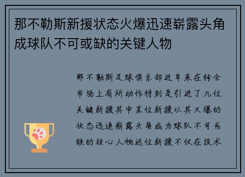 那不勒斯足球俱乐部近年来在转会市场上有所动作,特别是引进了几位关键新援。其中,某位新援以其火爆的状态迅速崭露头角,成为球队不可或缺的核心人物。这位新援不仅在技术层面展现出了非凡的能力,还凭借出色的比赛表现,深刻影响了球队的战术打法和整体表现...