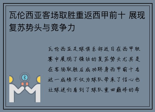 瓦伦西亚足球俱乐部近日在西甲联赛中展现了强劲的复苏势头,尤其是在客场取胜后,成功跻身西甲前十名。这一成绩不仅为球队带来了信心,也让球迷们看到了球队重回巅峰的希望。本文将从四个方面详细分析瓦伦西亚客场取胜重返西甲前十的原因,并探讨这一成绩背后...