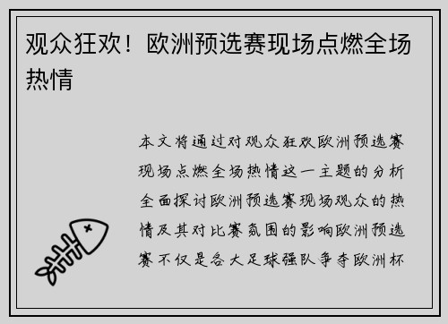 本文将通过对“观众狂欢!欧洲预选赛现场点燃全场热情”这一主题的分析,全面探讨欧洲预选赛现场观众的热情及其对比赛氛围的影响。欧洲预选赛不仅是各大足球强队争夺欧洲杯入场券的重要赛事,也是球迷与运动员之间情感互动的重要场所。本文将从四个方面进行详...