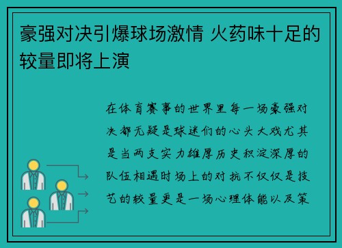 豪强对决引爆球场激情 火药味十足的较量即将上演