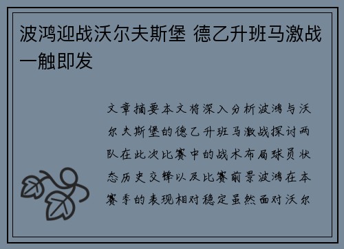 文章摘要:本文将深入分析波鸿与沃尔夫斯堡的德乙升班马激战,探讨两队在此次比赛中的战术布局、球员状态、历史交锋以及比赛前景。波鸿在本赛季的表现相对稳定,虽然面对沃尔夫斯堡这样强劲的对手,他们依然保持着一定的竞争力。而沃尔夫斯堡作为德甲常客,其...
