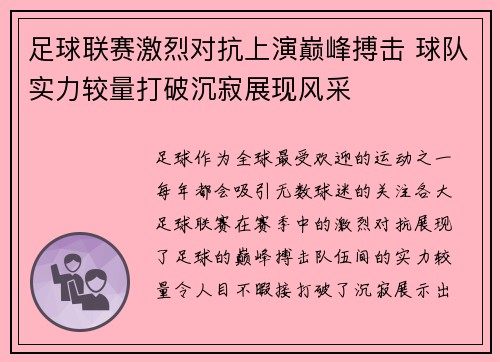 足球联赛激烈对抗上演巅峰搏击 球队实力较量打破沉寂展现风采