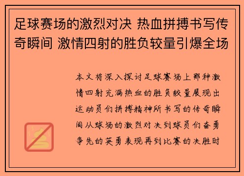 足球赛场的激烈对决 热血拼搏书写传奇瞬间 激情四射的胜负较量引爆全场激情