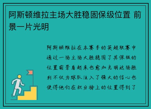 阿斯顿维拉主场大胜稳固保级位置 前景一片光明