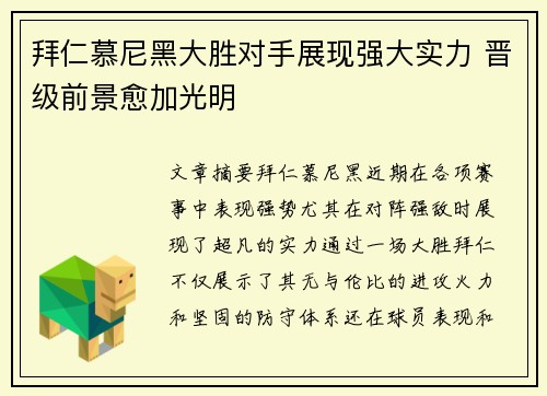 拜仁慕尼黑大胜对手展现强大实力 晋级前景愈加光明