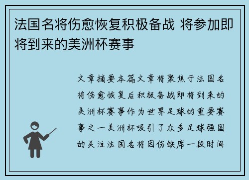 法国名将伤愈恢复积极备战 将参加即将到来的美洲杯赛事