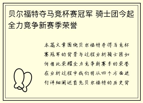 本篇文章围绕贝尔福特夺得马竞杯赛冠军的背景与过程,分析骑士团如何借此荣耀全力竞争新赛季的荣誉。在分析过程中,我们将从四个方面进行详细阐述:首先,贝尔福特的历史背景与成就,这为他夺得马竞杯赛冠军打下了基础;其次,马竞杯赛的具体过程和贝尔福特的...