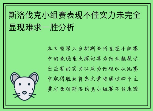 本文将深入分析斯洛伐克在小组赛中的表现,重点探讨其为何未能展示出应有的实力以及为何难以从比赛中取得胜利。首先,文章将通过四个主要方面对斯洛伐克小组赛不佳表现的原因进行详细分析。第一,斯洛伐克在阵容配置上的不足,第二,球队战术执行的偏差,第三...