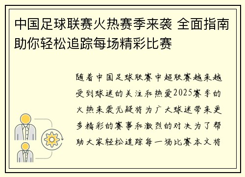 随着中国足球联赛(中超联赛)越来越受到球迷的关注和热爱,2025赛季的火热来袭,无疑将为广大球迷带来更多精彩的赛事和激烈的对决。为了帮助大家轻松追踪每一场比赛,本文将全面为您呈现中国足球联赛的赛季亮点及看点,涵盖从赛季前瞻、球队动态到赛程安...