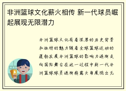非洲篮球文化有着深厚的历史背景和独特的魅力,随着全球篮球运动的蓬勃发展,非洲篮球的影响力逐渐走向国际舞台。在这一过程中,新一代非洲篮球球员逐渐崭露头角,展现出无限潜力,成为世界篮球舞台的重要力量。本文将从四个方面详细探讨非洲篮球文化的薪火相...