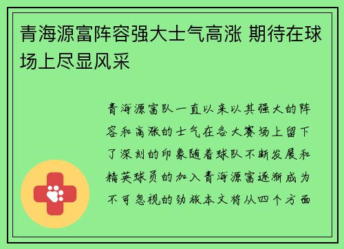 青海源富队一直以来以其强大的阵容和高涨的士气在各大赛场上留下了深刻的印象。随着球队不断发展和精英球员的加入,青海源富逐渐成为不可忽视的劲旅。本文将从四个方面对青海源富的强大阵容和士气高涨的现象进行详细探讨,并展望他们在未来比赛中如何尽显风采...