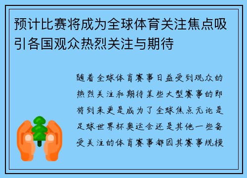 预计比赛将成为全球体育关注焦点吸引各国观众热烈关注与期待