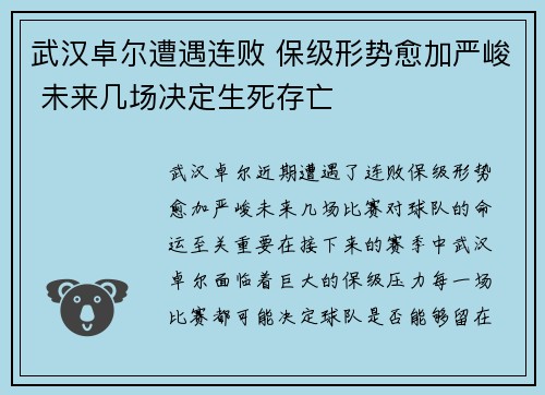 武汉卓尔遭遇连败 保级形势愈加严峻 未来几场决定生死存亡