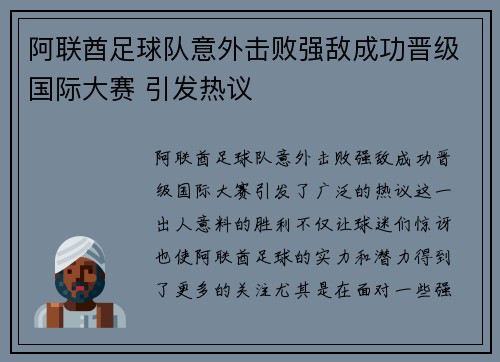 阿联酋足球队意外击败强敌成功晋级国际大赛 引发热议