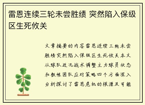文章摘要的内容:雷恩连续三轮未尝胜绩,突然陷入保级区生死攸关。本文从球队近况、战术调整、主力球员状态和教练团队应对策略四个方面深入分析,探讨了雷恩危机的根源及可能的解决之道。ng体育^...