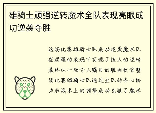 雄骑士顽强逆转魔术全队表现亮眼成功逆袭夺胜