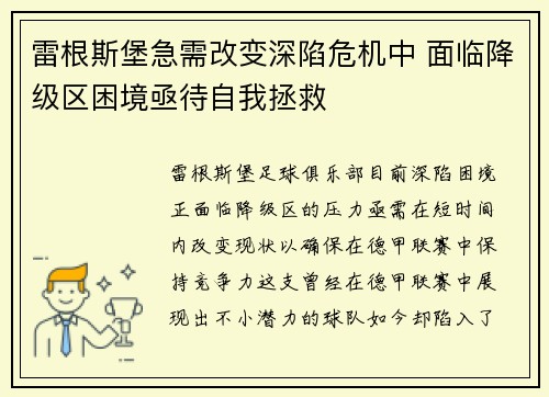 雷根斯堡急需改变深陷危机中 面临降级区困境亟待自我拯救