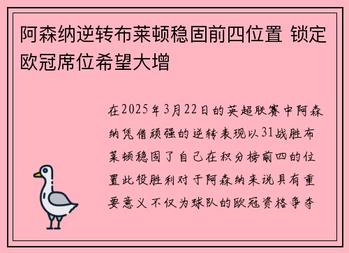 在2025年3月22日的英超联赛中,阿森纳凭借顽强的逆转表现,以3-1战胜布莱顿,稳固了自己在积分榜前四的位置。此役胜利对于阿森纳来说具有重要意义,不仅为球队的欧冠资格争夺提供了有力支持,也增强了球迷们对球队未来的信心。阿森纳在比赛中的表现...