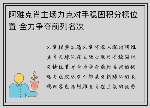 文章摘要:本篇文章将深入探讨阿雅克肖足球队在主场击败对手、稳固积分榜位置,并全力争夺前列名次的战略与成效。从多个维度分析球队的表现,内容包括阿雅克肖在主场的优势、关键球员的发挥、战术策略的调整,以及比赛中对手的应对。通过对这些方面的细致剖析...