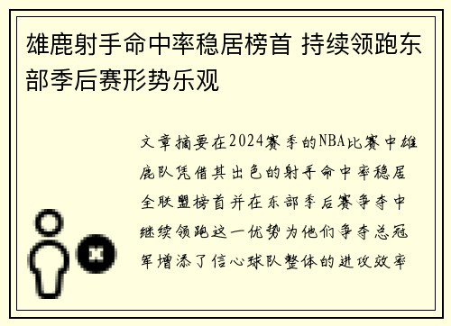 雄鹿射手命中率稳居榜首 持续领跑东部季后赛形势乐观